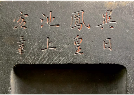 我們再仔細觀摩此硯。硯長14.3cm,寬8.9cm,高2.8cm,材質為歙石,包漿醇厚自然。硯面雕鳳凰梅花,周飾回紋,硯背覆手較深。背后銘文:“異日鳳皇池上客,三華”。鳳皇即鳳凰,三華即榮漣字號。該硯形制敦厚,銘文書風典雅,刻工細致精到,硯堂深凹,雕工屬典型的“明大粗”??上с懳暮统幪媒杂腥藶榘咩?,當屬流傳過程中有外行畫蛇添足,但仍然瑕不掩玉。題刻“異日鳳皇池上客”,與硯面雕刻鳳凰梅花相呼應。該銘文精致細膩,率性而行,出塵脫俗,于端嚴中蘊含秀美之氣,其落筆灑脫,游刃有余,雖字數不多,但清雅之趣盈然硯上。我們知道“榮漣少孤多病,母命入明陽觀為道士”,顯然榮漣本人不會有“學優取仕”的人生理想。從資料顯示榮漣尊母命入玄門后樂志詩、書、畫三藝。從銘文的內容分析,推測當是彼時富家或學子慕名托榮漣題銘。