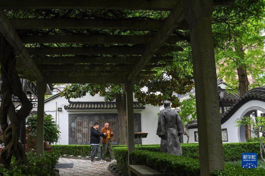 王康(左)和他的師傅馬萌青在金陵刻經處散步、討論技藝(4月15日攝)。