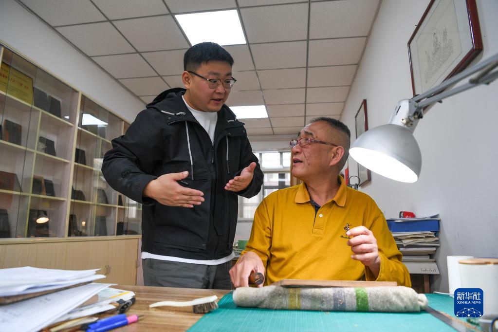 王康(左)和他的師傅馬萌青在工作區討論鐫刻技藝(4月15日攝)。