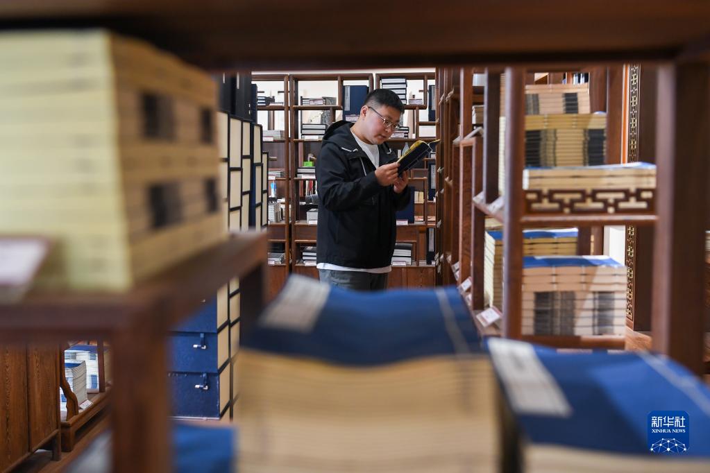 王康在金陵刻經處流通展示中心根據古刻本借鑒刻字技法(4月15日攝)。