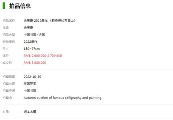 英國羅素拍賣有限公司在2022年10月30日舉行的中國書畫大型拍賣會專場上,此前備受關注的畫家佘玉奇作品《輕舟已過萬重山》經多輪激烈競逐,最后以308萬落槌成交。