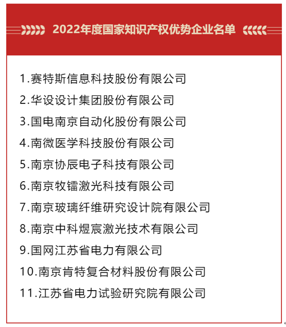 近日,國家知識產權局公布了2022年度國家知識產權示范企業和優勢企業認定名單,南京共有15家企業入圍。