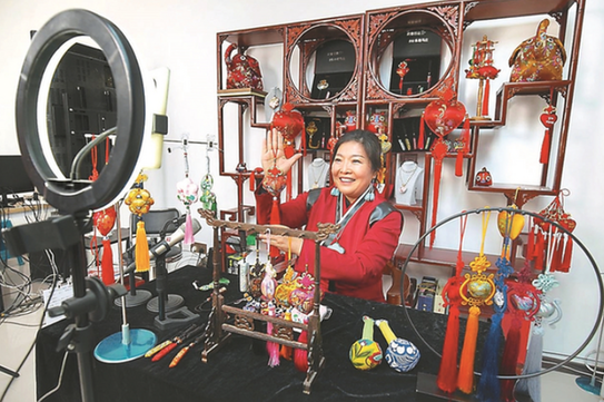 馬莊村黨委副書記、村委會主任王俠在香包直播工作室與網友互動。 張濤 攝