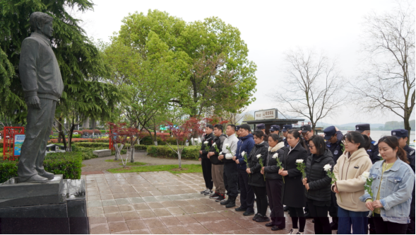 4月3日,在南京市玄武區見義勇為廣場周光裕銅像前,參與祭掃的同志們整齊列隊、肅然站立,為周光裕敬獻鮮花、脫帽默哀。2001年10月,下崗工人周光裕面對窮兇極惡的違法犯罪分子,毫無畏懼,挺身而出,用生命捍衛了人民群眾的人身和財產安全,其英勇事跡響徹金陵、廣為傳頌。
