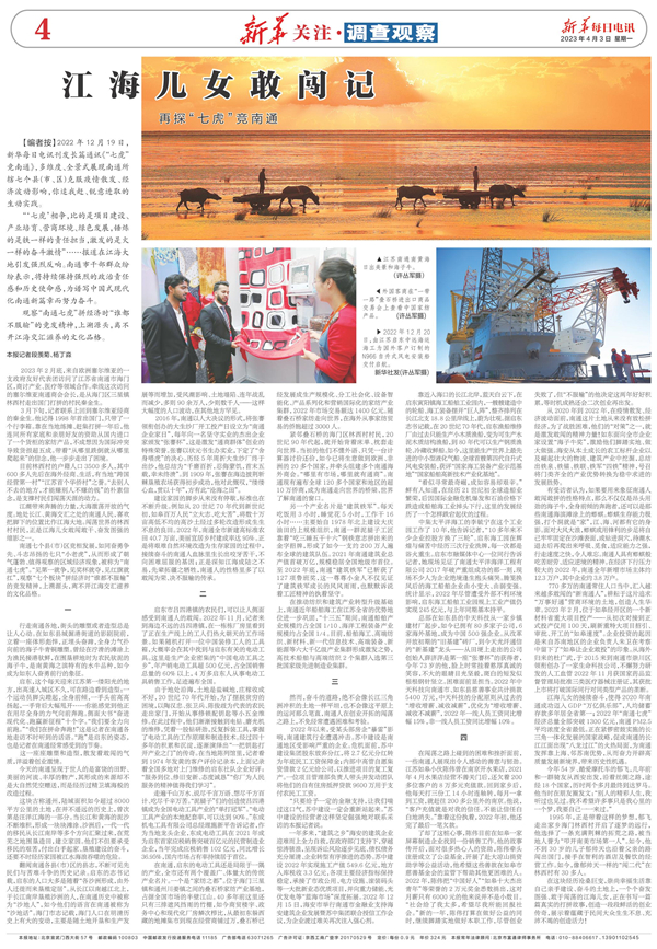 2022年12月19日,新華每日電訊刊發長篇通訊《“七虎”競南通》,多維度、全景式展現南通所轄七個縣(市、區)克服疫情散發、經濟波動影響,你追我趕、銳意進取的生動實踐。2023年4月3日,其姊妹篇《江海兒女敢闖記——再探“七虎”競南通》重磅出爐,深度揭示“南通七虎”拼經濟時“誰都不服輸”的競發精神,上溯源頭,離不開江海交匯滋養的文化品格。