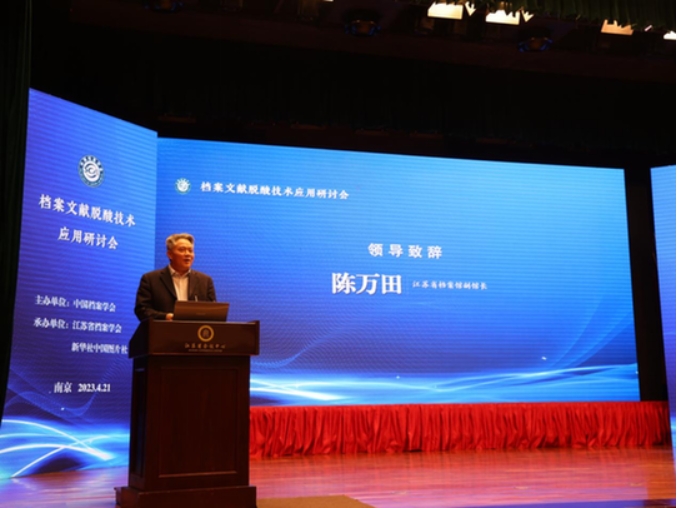 中國檔案學會副理事長兼秘書長鄧小軍,新華社中國圖片社黨委常委、副總裁楊玉玲,江蘇省檔案館副館長陳萬田出席本次研討會并致辭。