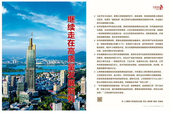 ??? 通計熟籌,蹇視高步。江蘇堅定不移沿著總書記指引的方向前進,牢牢把握“爭當表率、爭做示范、走在前列”這個總要求,時時瞄準“在高質量發展上繼續走在前列”這個總目標,精心描繪“建設‘強富美高’新江蘇”這個總藍圖,努力以一域之光為全局添彩。
