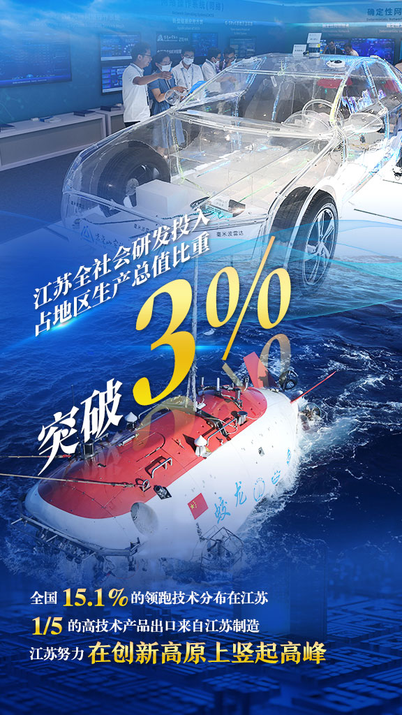 ??? 目前,江蘇全社會研發投入占地區生產總值比重突破3%,達到創新型國家和地區中等水平;全國15.1%的領跑技術分布在江蘇,五分之一的高技術產品出口來自江蘇制造。