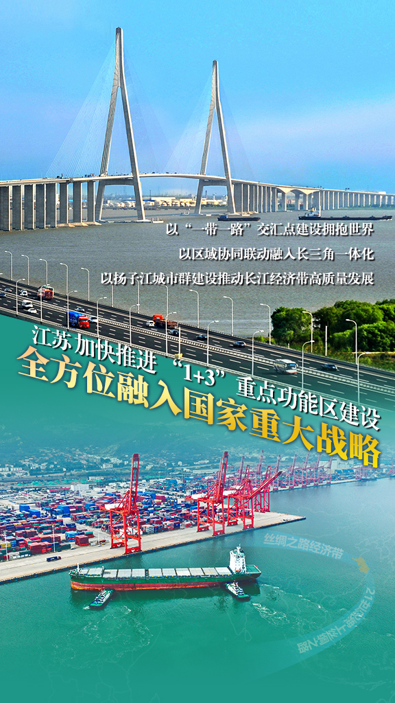??? 提要鉤玄,綱舉目張。以“一帶一路”交匯點建設擁抱世界,以區域協同聯動融入長三角一體化,以揚子江城市群建設推動長江經濟帶高質量發展……江蘇以大視野謀篇大格局,加快推進以揚子江城市群和沿海經濟帶、江淮生態經濟區、徐州淮海經濟區中心城市為總體布局的“1+3”重點功能區建設,全方位融入國家重大戰略,更好服務全國構建新發展格局。
