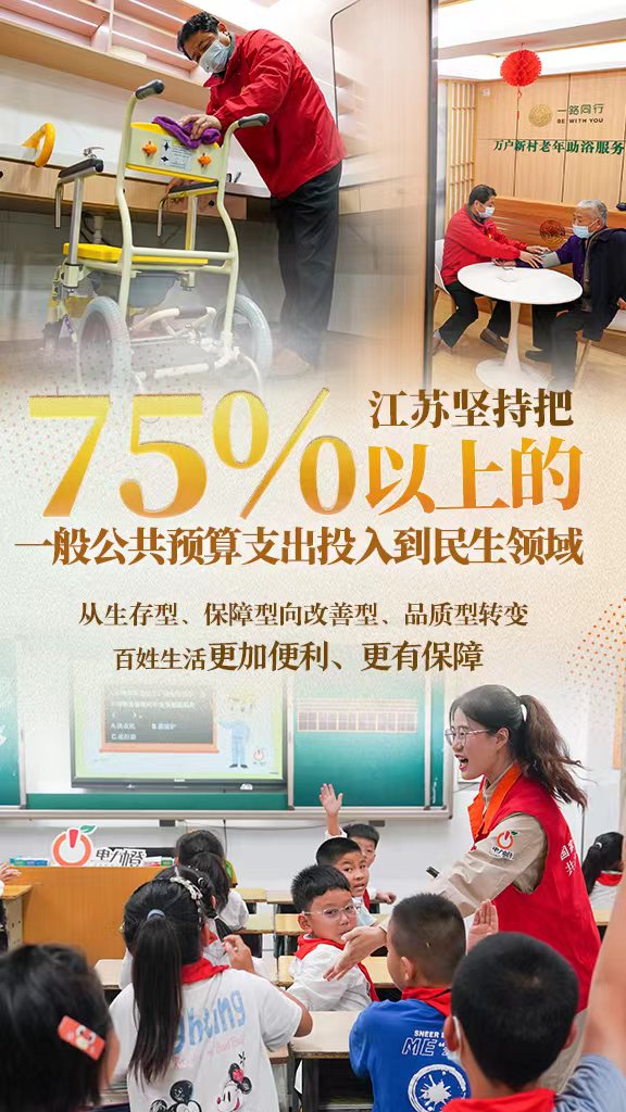 ??? ◆ 人民幸福安康是推動高質量發展的最終目的。不斷滿足人民對美好生活的向往,江蘇堅持盡力而為、量力而行,兜牢民生底線,提升全生命周期公共服務質量,在推動高質量發展中創造高品質生活。新時代以來,江蘇堅持把75%以上的一般公共預算支出投入到民生領域,實現更高水平的“民生七有”。
