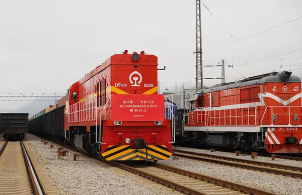 這趟中歐(亞)班列是自1992年12月新亞歐大陸橋開通運營以來第15000列“連云港—中亞五國”雙向對開班列。該班列滿載瓷磚、輪胎、油脂加工設備等生產生活物資,將經霍爾果斯口岸出境開往哈薩克斯坦、烏茲別克斯坦。