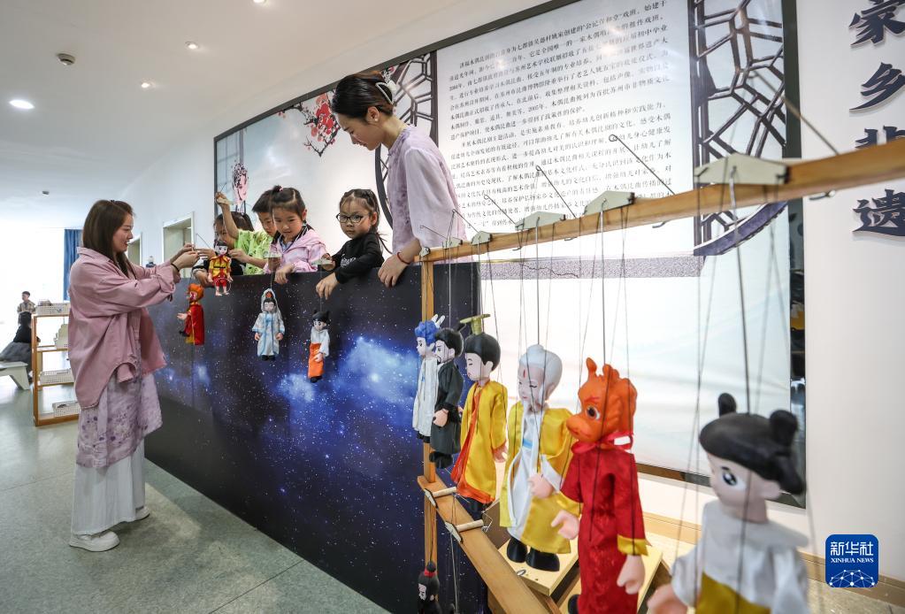 孫菁(右一)、施錦芳(左一)在七都幼兒園指導小朋友操作木偶(4月20日攝)。