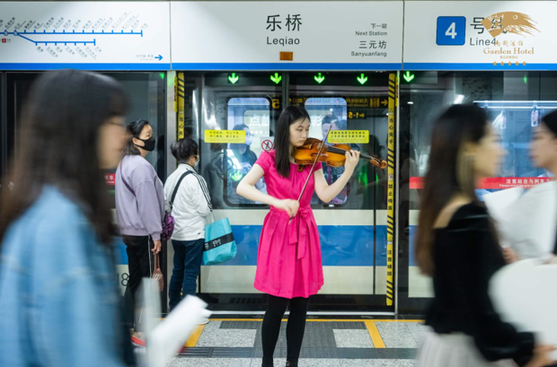 當天,南園賓館邀請小提琴演奏者王奕晴在樂橋站站臺傾情演奏《德沃夏克的浪漫曲》,這首詮釋浪漫愛情主題的曲目,旋律動聽優美,情感表達深摯,現場音樂與藝術氛圍深富感染力,引得眾多游人乘客駐足聆聽,沉浸感悟萬千心緒。