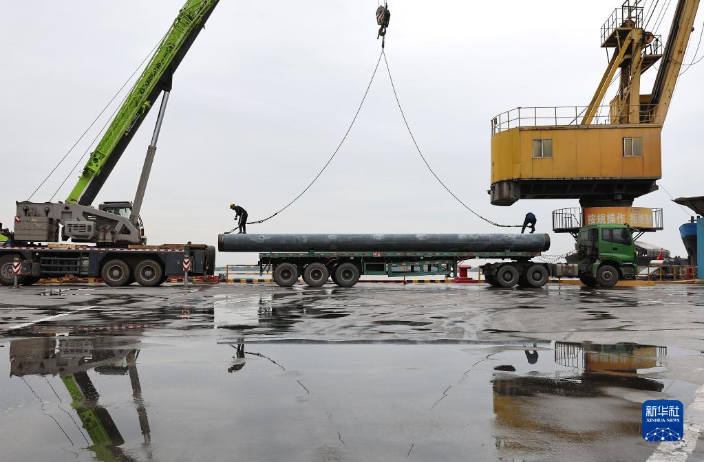 5月24日,工人在碼頭上吊裝建材產品,準備外運。