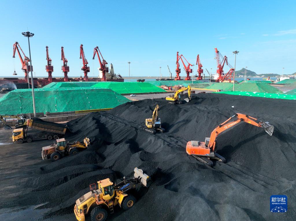 5月24日,大型機械在江蘇省連云港港煤炭碼頭堆放儲存剛從貨輪卸運的電煤(無人機照片)。