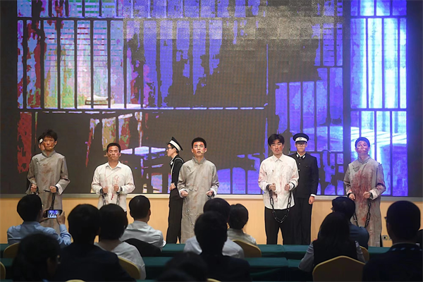 現場,南京市第五高級中學高一學子演出話劇《鐵血烈士趙良璋》,再現了趙良璋等北平五烈士壯烈犧牲前的場景。雨花英烈趙良璋是南京市第五高級中學的校友。1946 年,趙良璋秘密加入中國共產黨。他深入 “虎穴”,成功收集到大量重要情報傳遞給延安,犧牲時年僅 27 歲。這群當代中學生在讀完學長趙良璋的故事后,深受觸動,于是查閱史料文獻,自編自導自演。這也是雨花臺烈士紀念館和南京市第五高級中學合作的新形式思政課。