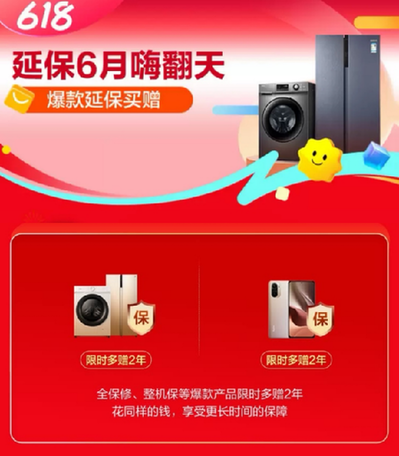 夏季電器產品使用頻繁,萬一出現故障怎么辦?實時選購或者事后補購延保服務,是您明智的選擇。值得一提的是,618活動期間部分延保單品,限時至多再加贈2年,您花同樣的錢可以額外多享受2年延保服務,省錢更超值。