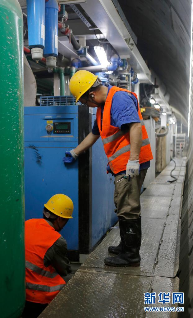 ????6月7日,在江蘇蘇州軌道交通8號線時代廣場站至右岸街站隧道區間,中鐵十局城軌公司維保人員在檢查盾構設備。