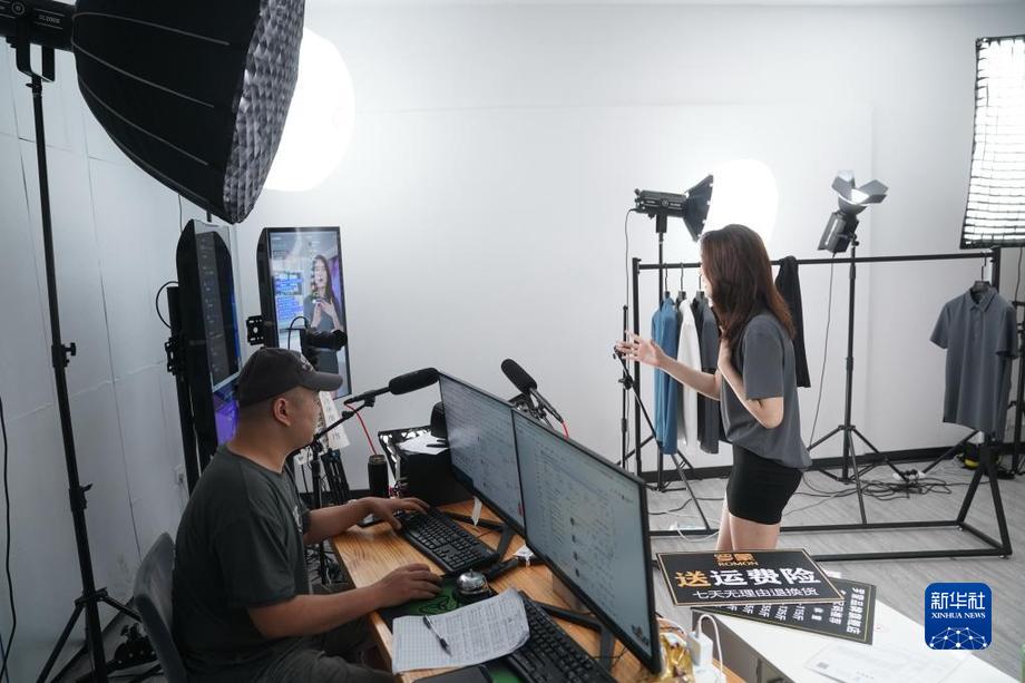 ????6月7日,在常熟市云裳小鎮一家服裝企業,主播在直播帶貨。