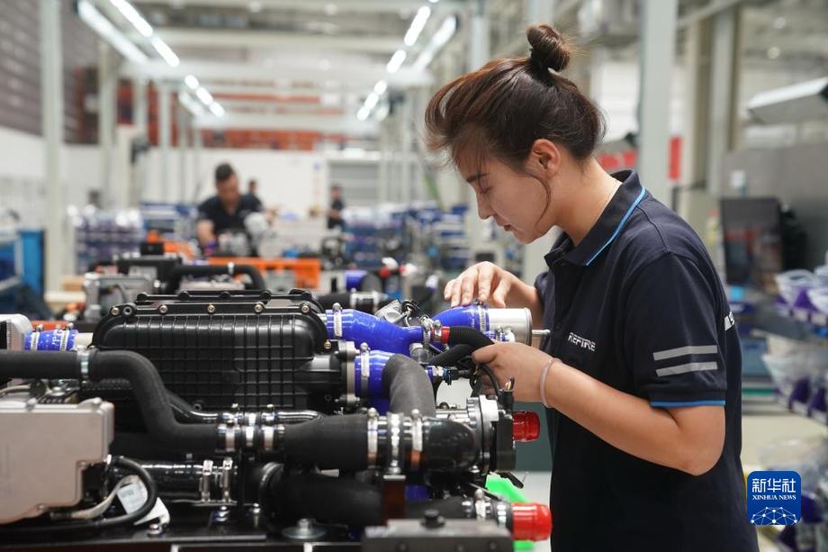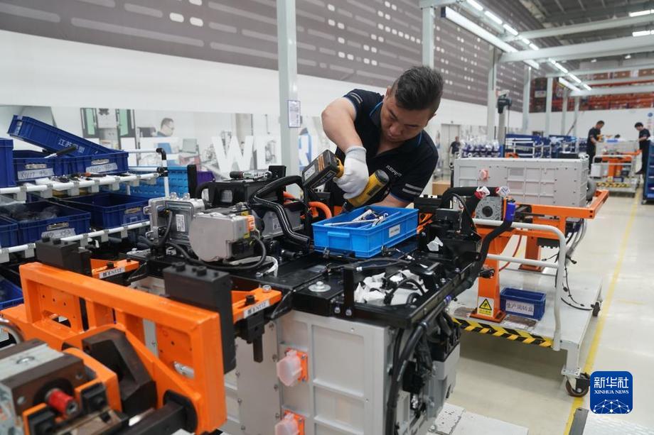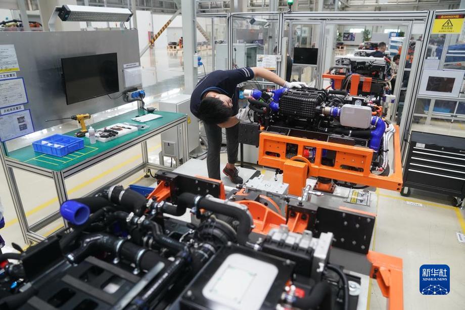 ????6月7日,在位于常熟的江蘇重塑能源科技有限公司,員工在生產線上組裝氫燃料電池系統。