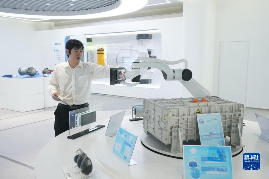 ????6月7日,在位于常熟的中歐氫能技術創新中心,工作人員在介紹氫燃料電池電堆。