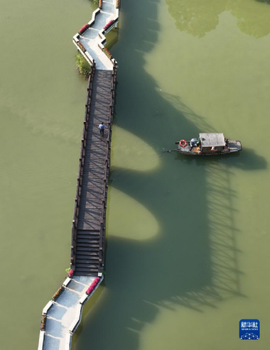 6月9日,游人乘船游覽沙家浜國家濕地公園(無人機照片)。