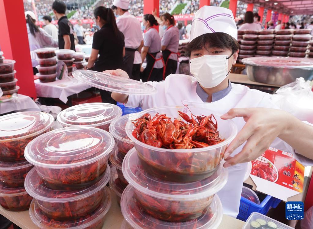 6月13日,工作人員在為萬人龍蝦宴準備小龍蝦。