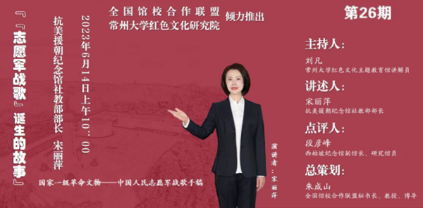 為推動用好用活革命文物工作,由全國館校合作聯盟主辦,中國文物交流中心指導,常州大學馬克思主義學院、常州大學近現代史與紅色文化研究院聯袂推出“革命文物融入‘思政課’全國百館百校紅色講壇”(簡稱“‘雙百’講壇”)第26期網絡課程活動,6月14日在網絡上成功舉辦。本期邀請抗美援朝紀念館社會教育部部長宋麗萍擔任講述人,西柏坡紀念館副館長段彥峰擔任點評人。來自全國館校合作聯盟理事單位的常州大學、抗美援朝紀念館、西柏坡紀念館等高校部分師生及博物館人,通過線上方式參加了此次活動。該活動由全國館校合作聯盟秘書長朱成山教授擔任總策劃和總撰稿。