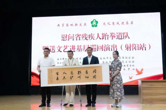 6月13日,由鹽城市殘疾人聯合會、鹽城市文學藝術界聯合會聯合舉辦的“共享鹽城新發展,文化惠殘進基層——慰問江蘇省殘疾人跆拳道隊暨送文藝進基層巡演”活動第四站,在射陽縣特殊教育學校舉行。鹽城市殘聯副理事長朱友余出席活動并發表講話,射陽縣殘聯黨組書記、理事長倪劍致辭。射陽縣部分殘疾人、縣特校師生和江蘇省殘疾人跆拳道隊隊員等近百人現場觀看了文藝演出。