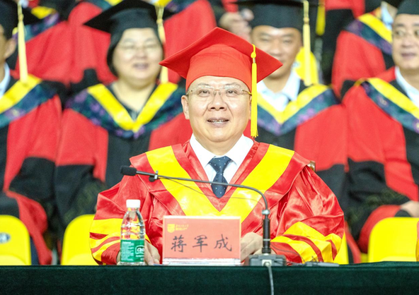 “站在人生新的節點上,希望大家在實現民族復興的賽道上奮勇爭先?!碑厴I典禮上,蔣軍成以“挺膺擔當向未來”為題贈言畢業生。