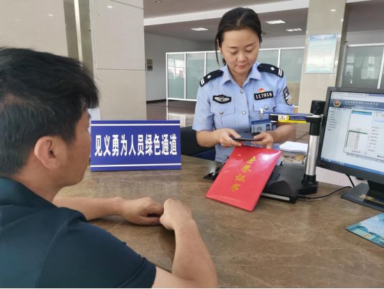 “真想不到,車管所竟然專門為我們設立‘見義勇為人員綠色通道’,真是太暖心了?!?月13日下午,在丹陽市公安局交警大隊車輛管理所服務大廳,榮獲“江蘇省見義勇為先進群體”榮譽稱號的丹陽市大力神科技集團職工周林,前來辦理車輛年審業務,服務大廳導辦員直接將他引導至“見義勇為人員綠色通道”,整個過程僅用了5分鐘,效率之高讓周林頻頻點贊。