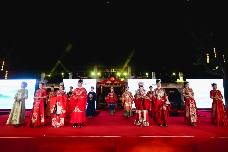 19點19分,20位模特從欞星門款款而出,充分詮釋非遺之美,華服之贊,為在場的賓客奉上了一場國潮婚嫁服飾盛宴?!盎ńz萬縷織金冠,妙手鑲嵌有乾坤”,這場婚嫁系列大秀,讓人欣賞到云錦婚服,傳統中式婚服以及金銀細工古法金首飾的相互輝映、賦能添彩之美。