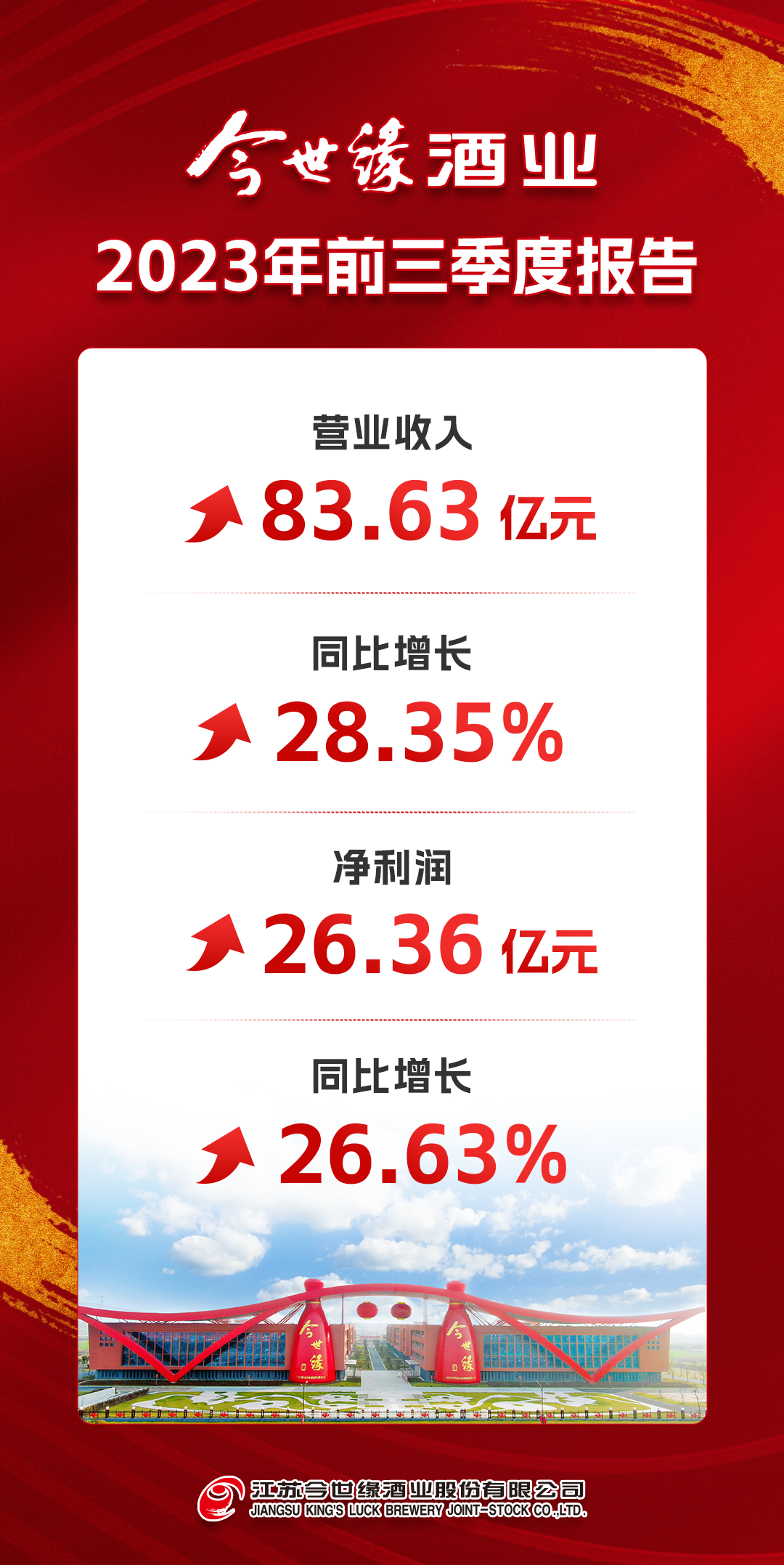 10月30日晚間,江蘇今世緣酒業股份有限公司發布2023年三季度報告。報告顯示,2023年前三季度,公司實現營業收入83.63億元,同比增長28.35%;實現凈利潤26.36億元,同比增長26.63%;基本每股收益2.1139元/股。2023年第三季度,公司實現營業收入23.94億元,同比增長28.04%;實現凈利潤5.86億元,同比增長26.38%。