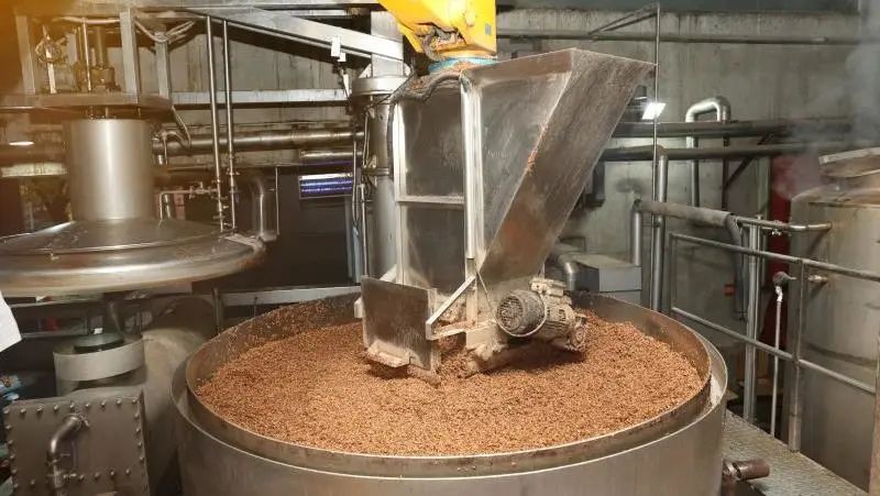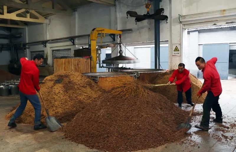 釀酒師傅們熟練地用手中的鐵鏟把封窖泥取下,開窖之后的酒醅散發出陣陣酒香。將發酵成熟的酒醅拌入新糧后,便開始裝甑。裝甑的要訣是“輕、松、薄、勻、平、準”,所有的動作,需要釀酒師傅兩秒內完成。