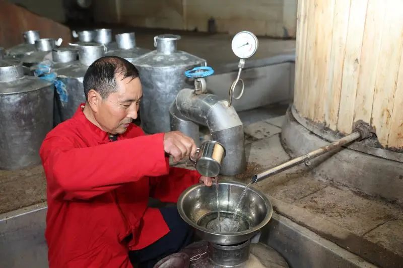 裝甑完畢,開始蒸餾。隨著酒汽的冷凝,一縷縷原酒自接酒口緩緩流出。酒甑旁,經驗豐富的釀酒師傅看著酒花,摘取一杯,端杯淺飲,細細品味,眉宇間盡是收獲的喜悅。