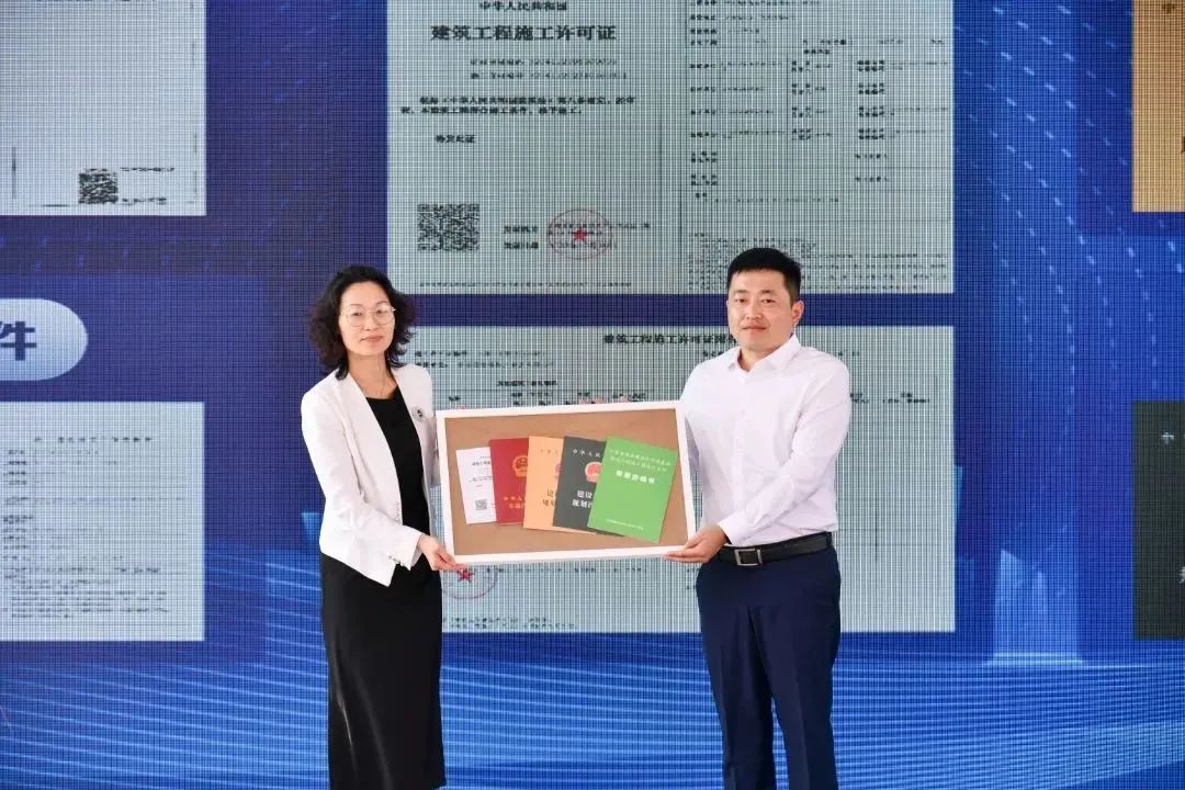 區行政審批局局長趙文君為項目頒發不動產證、用地規劃許可證、工程規劃許可證、審圖合格證及施工許可證,常高新集團副總經理盧金河代表公司做開工致辭,項目總包方晉陵建設公司做項目施工情況介紹。