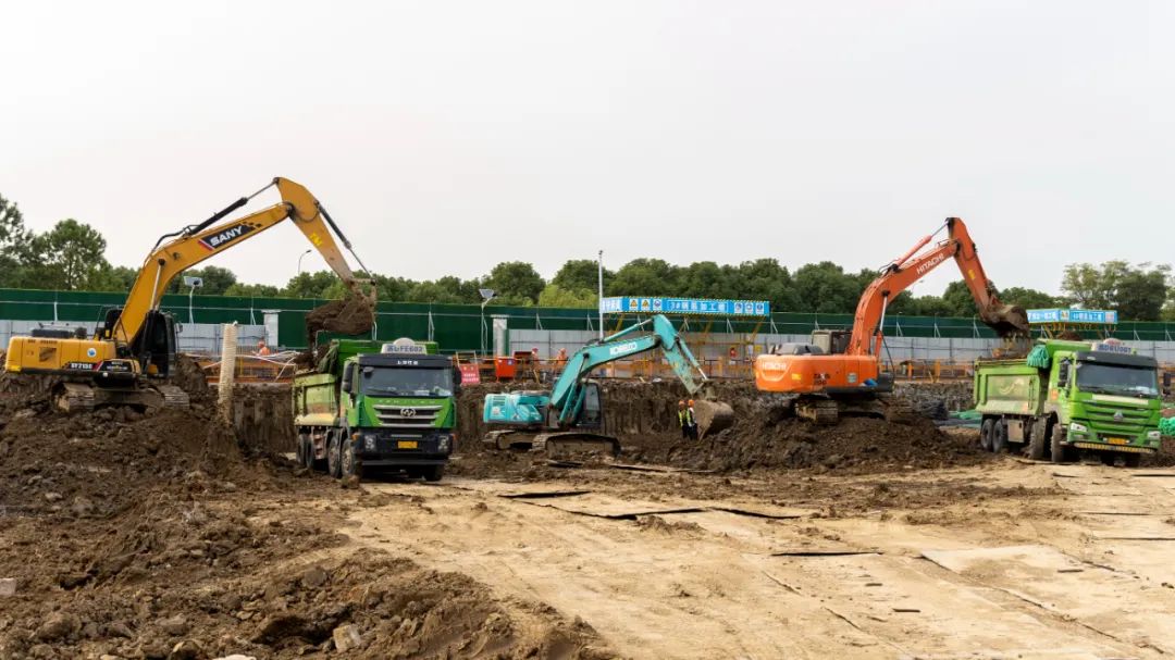 在項目施工現場,10余臺挖掘機每天持續轟鳴著,揮舞長臂來回作業,60余名建設工人各司其職,揮灑汗水抓緊施工,另外還有50余土方車輛穿梭其間,“滿弓”作業,確保項目所需土方的順利運輸。