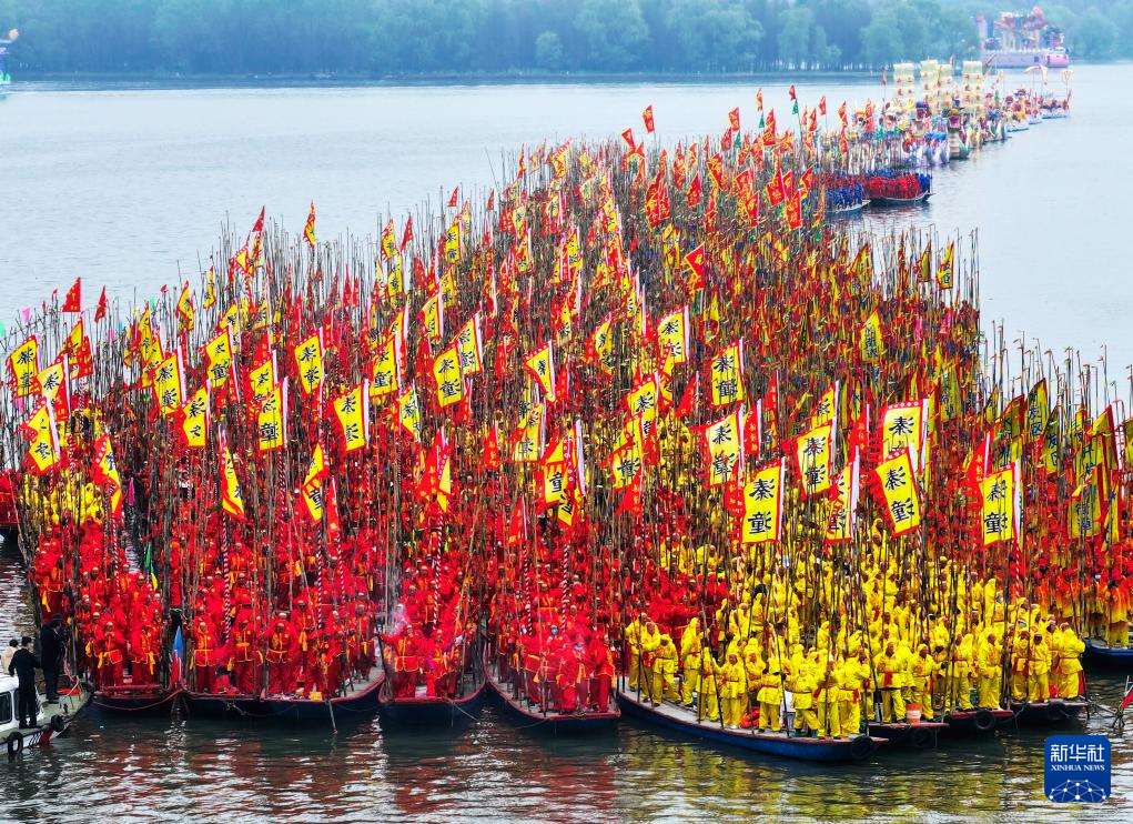 4月6日,參加溱潼會船表演的船只在湖面上整裝待發。