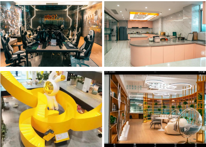 社區內有商業街區、啤酒公園、衛生服務站、共享廚房、未來人才體驗中心等功能設施,秋白微書房、電競房、桌游室和籃球場、空中足球場等活動空間,還有孵化器、創意園、路演大廳、直播間等共享空間。