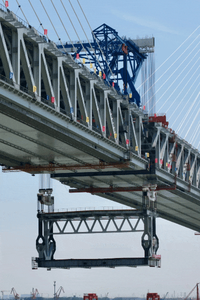 此次吊裝的合龍段鋼桁梁長14米,寬35米,重約800噸。合龍段吊裝完成后,將按照先邊跨后中跨的順序進行合龍施工,即先與泰興側邊跨合龍后,通過縱向頂推、橫向對拉、斜拉索索力調整等措施,將合龍口兩側鋼桁梁的縱向、橫向、豎向距離調整到毫米級精度。隨后還將開展高強螺栓施擰、鋼桁梁焊接和最后一組斜拉索安裝等一系列作業,實現最終合龍。