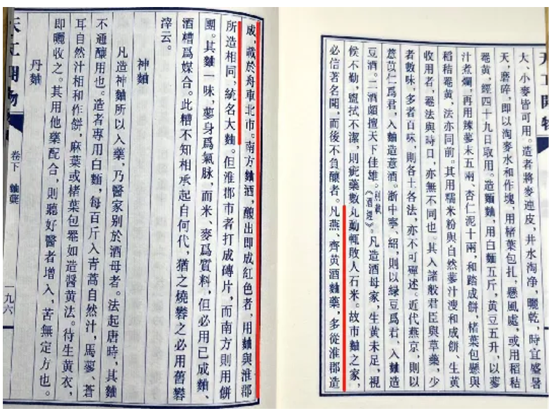 其實,古書早有記載,淮安有悠久的制曲歷史?!短旃ら_物》第十七卷記載:“凡燕齊……曲藥,多從淮郡造成,載于舟車北市,南方曲酒,用曲與淮郡所造相同,但淮郡市者打成磚片,而南方則用餅團……”淮安制曲歷史悠久,在歷史演變中改變了傳統酒曲的制作方法。