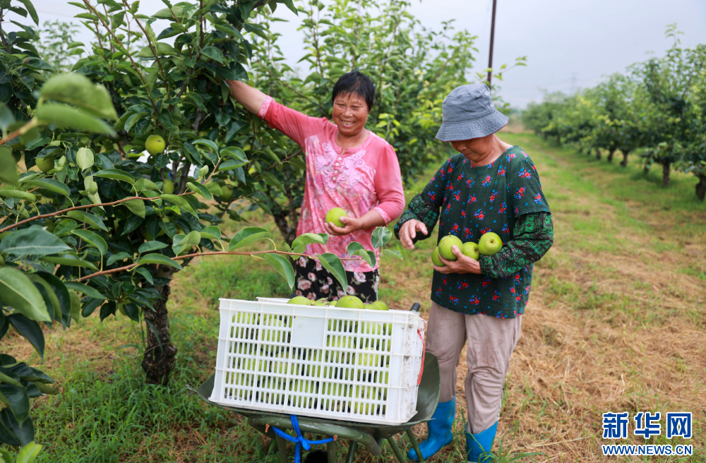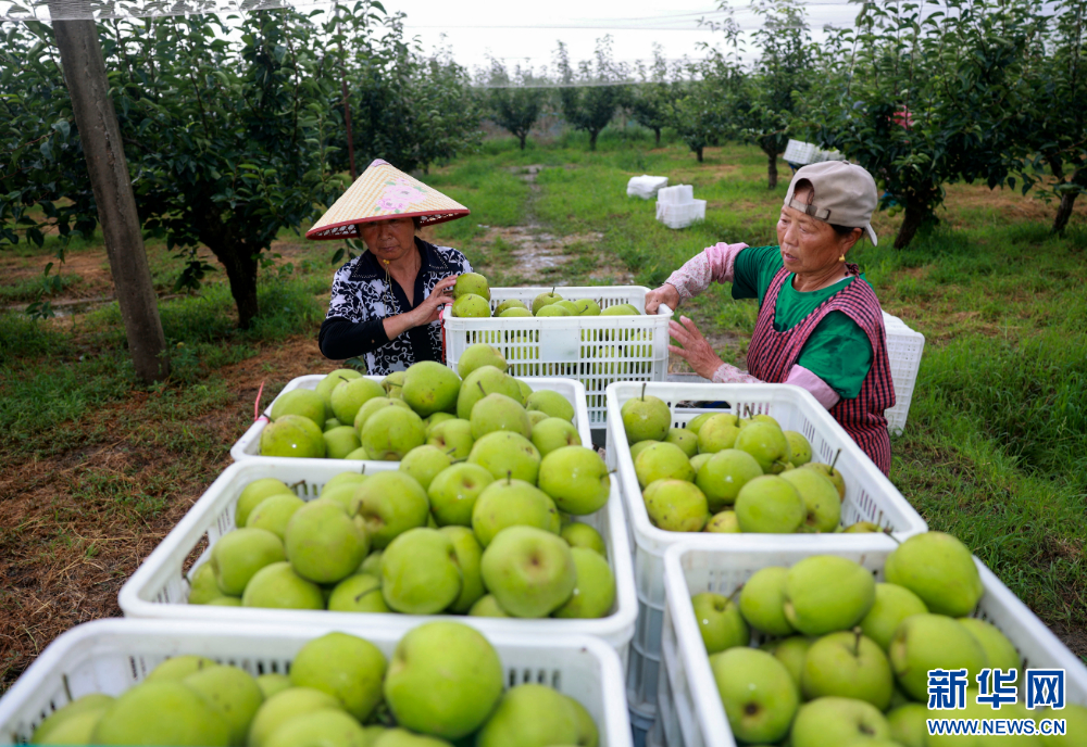 近日,江蘇省泰興市濟川街道各個梨園種植的早熟梨陸續上市,梨農們趁著雨止間歇,搶摘鮮梨,供應市場。