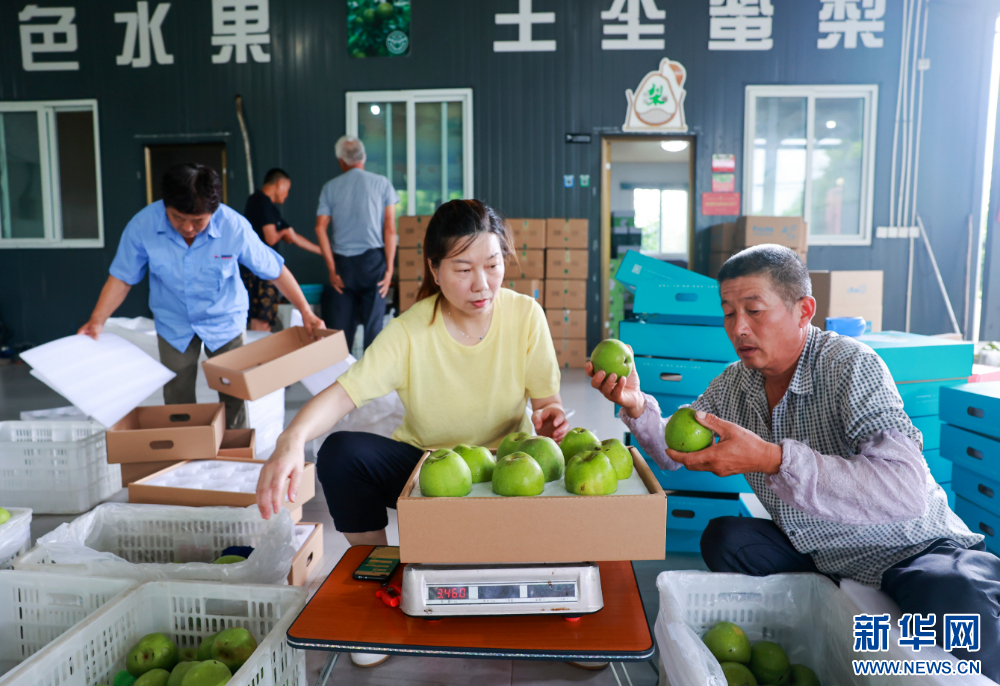 在江蘇省泰興市倩倩果樹種植園,梨農在給早熟梨稱重裝盒。