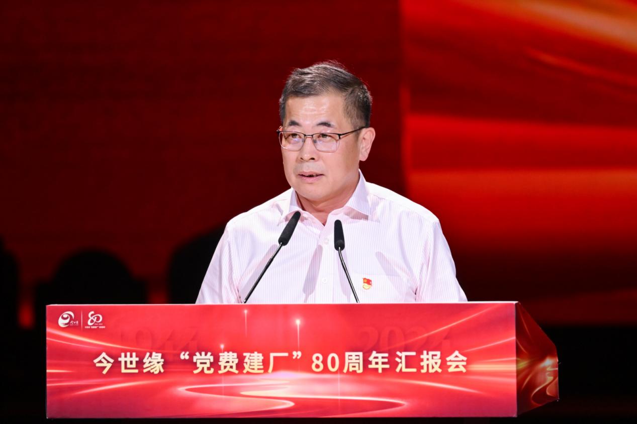 江蘇今世緣酒業黨委書記、董事長、總經理顧祥悅致辭時表示,歷史見證壯闊征程,時間鐫刻奮斗足跡。80年來,從六塘河畔的金莊槽坊起航到高溝酒廠的誕生,從作坊式的小廠到現代化企業,從傳統生產到智能釀造,從破產重組到成功上市,從計劃經濟到市場經濟,在黨的堅強領導下,一代又一代人傳承黨費建廠紅色基因,今世緣酒業書寫了開拓與奮進、光榮與夢想的醇香華章。從1956年榮獲省政府“釀酒第一”獎旗,到1984年全國評酒會第2名;從白酒行業科技進步一等獎,到國緣系列3款產品榮獲國家綠色食品認證。歷經品牌重塑、品質創新,已經形成“國緣”“今世緣”“高溝”三大著名品牌。國緣四開成為中國中度高端白酒500元價格帶單品銷量第一。品牌價值持續提升,產品質量、研發水平始終處于行業前列。