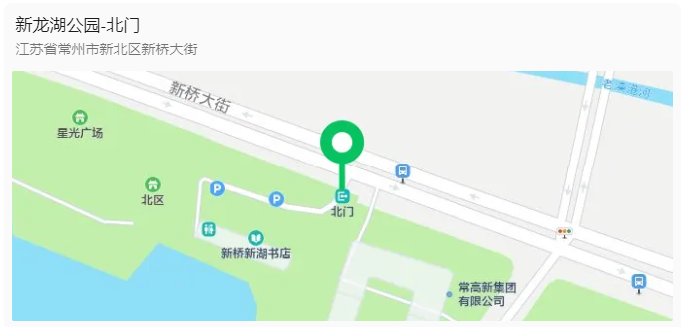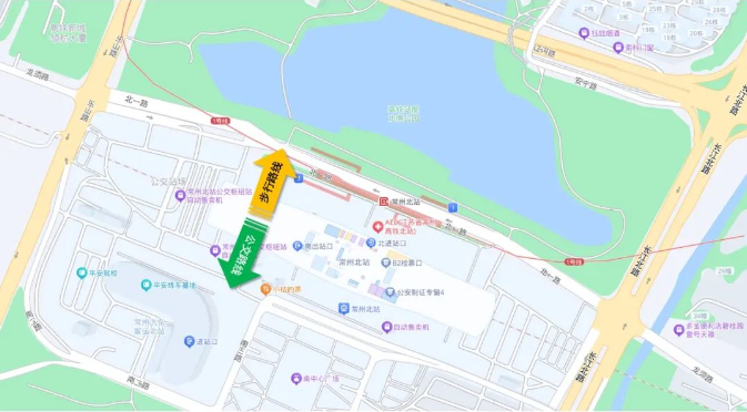 方案C:常州北站出站口向南,步行至常州客運中心乘坐公交B10或26路,至“地鐵新橋站”下車,步行300米到達活動場地。常州北站出站口向北,過北一路進入新龍湖公園,沿湖向北800米到達活動場地。