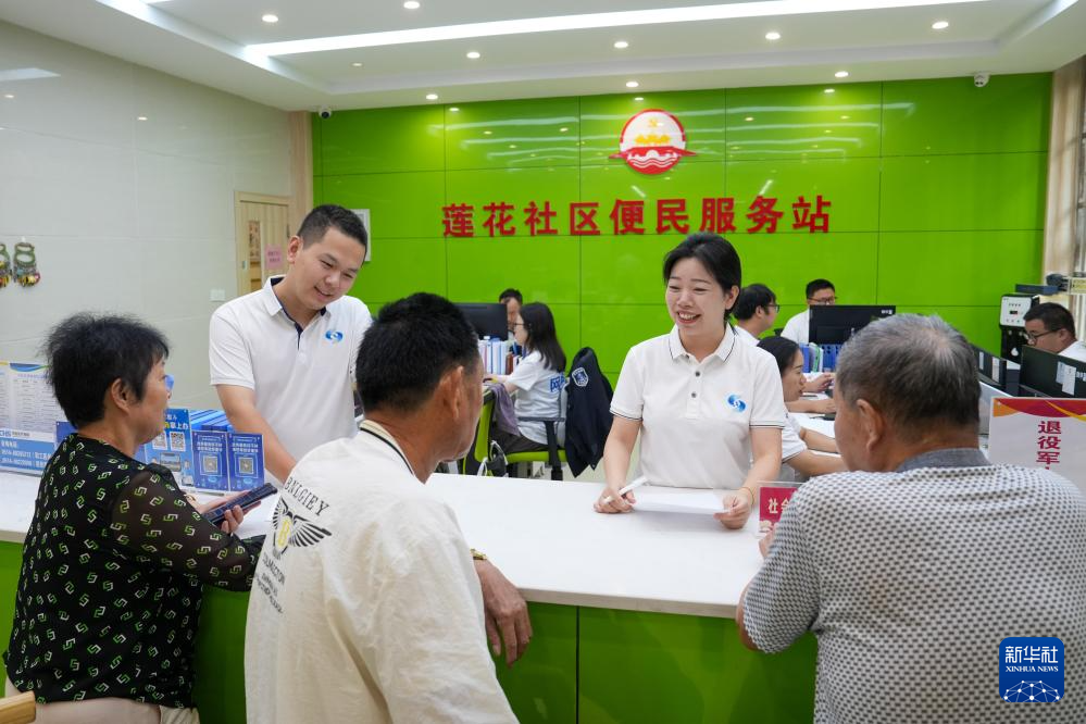 8月30日,在揚州市寶應縣安宜鎮蓮花社區便民服務站,工作人員為社區居民提供服務。