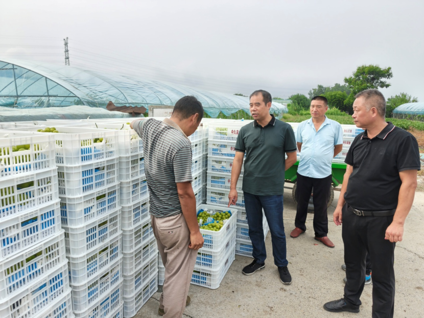 首先來到了志成果蔬種植家庭農場,該農場現有規模葡萄種植50畝,農場主鄧銀權詳細介紹了,葡萄園里的基礎設施情況、葡萄生產和銷售情況。張杰華詳細詢問了葡萄園的水肥一體化設施運行情況,在設備運行下節省勞動力和節約成本方面進行了深入交流。鄧銀權表示該設施在節水、節肥以及提高葡萄品質方面具有顯著作用,大大節省了農場的支出。由于今年夏季氣溫高、雨水少,好在水肥一體化技術的推廣,極大提升葡萄單產能力。張杰華強調,要不斷優化水肥一體化技術,使其更好地服務于葡萄生產,提高葡萄產業的現代化水平。鄧銀權還詳細介紹了今年葡萄的產量、品質以及銷售渠道等方面的情況。張杰華和沈建全認真傾聽,不時點頭表示肯定。他們對農戶們的辛勤付出表示感謝,并鼓勵農戶們要繼續發揮吃苦耐勞的精神,不斷提高種植技術,為鄉村產業振興貢獻自己的力量。
