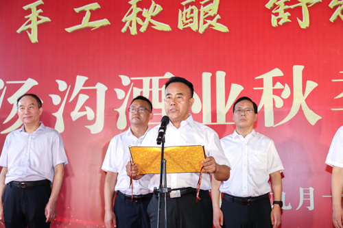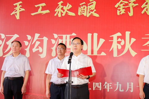 開窖儀式上,釀酒工匠徐盛致開釀詞。金秋開窖,是湯溝人傳承千年釀造技藝的堅守,更是千百年來匠心傳承的延續和發展。湯溝酒業副總經理周達中現場宣布2024金秋手工班正式開釀。