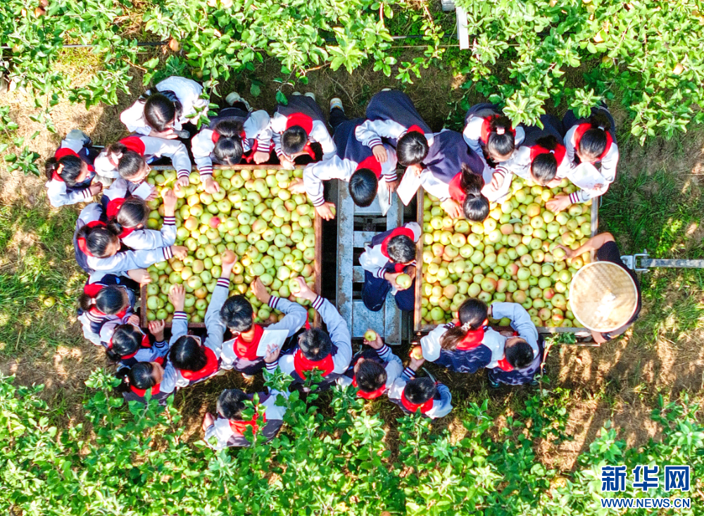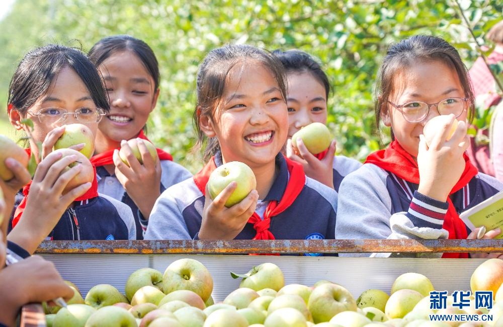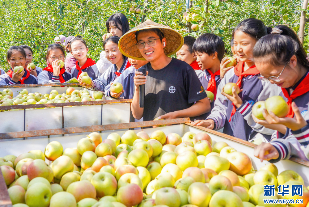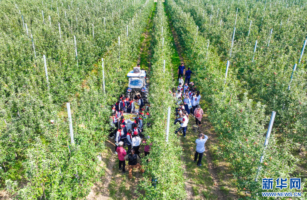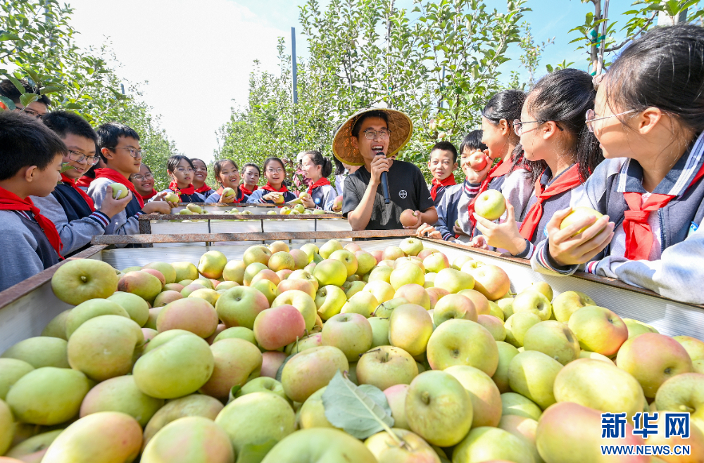 9月25日,江蘇省宿遷市洋河新區鄭樓實驗學校的學生走進斯味特萬畝蘋果園,聽農技人員講解蘋果種植的知識,感受豐收的喜悅。