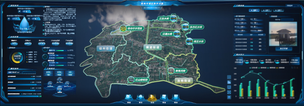 依托物理流域、時空數據和專業模型,對物理流域全要素和水利治理管理活動全過程進行智能模擬,建成新禹河灌區全要素數據底板,構建了灌區模型平臺以及知識平臺。利用三維仿真技術,對灌區流域、灌區工程、灌區治理管理對象、影響區域等進行數字映射,利用模型平臺和知識平臺實現智慧模擬、仿真推演,搭建新禹河數字孿生平臺,能夠實時采集、匯總感知點的水情、雨情、工情,提供精準調度,在防洪上能夠做到預報、預警、預演、預案,支撐灌區智慧業務應用。